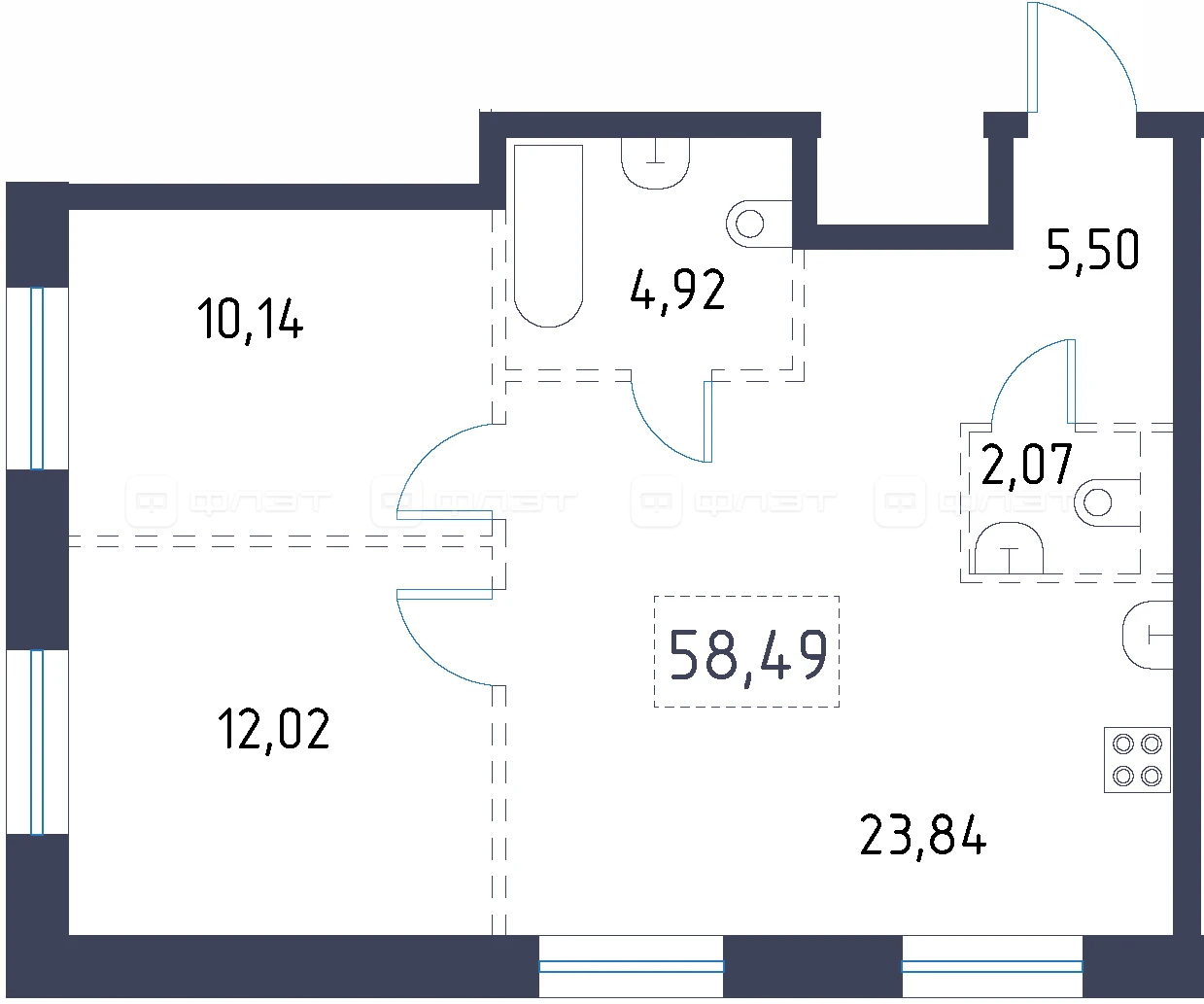 - 58.49/22.16/23.84 м²